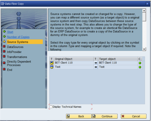 In the next screen, we can define the source system to be used for the new objects if any. In this case, we are extracting from the same source system so we leave it as “=”. You could use this step to redirect a copy to a new source system or second source system. Click “Continue”.