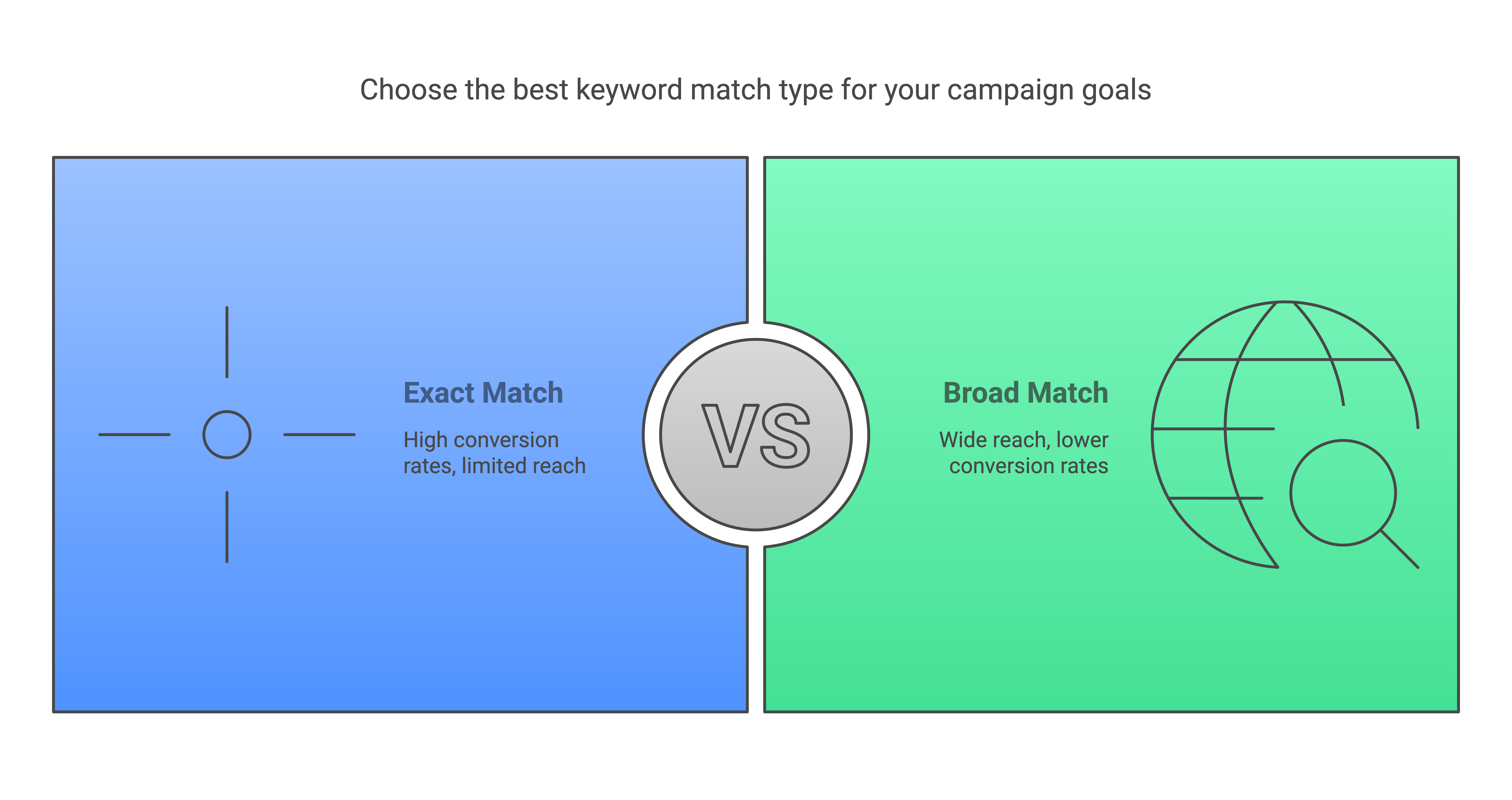 - Exact match: Ads show only when a query matches the specific keyphrase, limiting reach but potentially yielding higher conversion rates, especially if tied to high purchase intent.